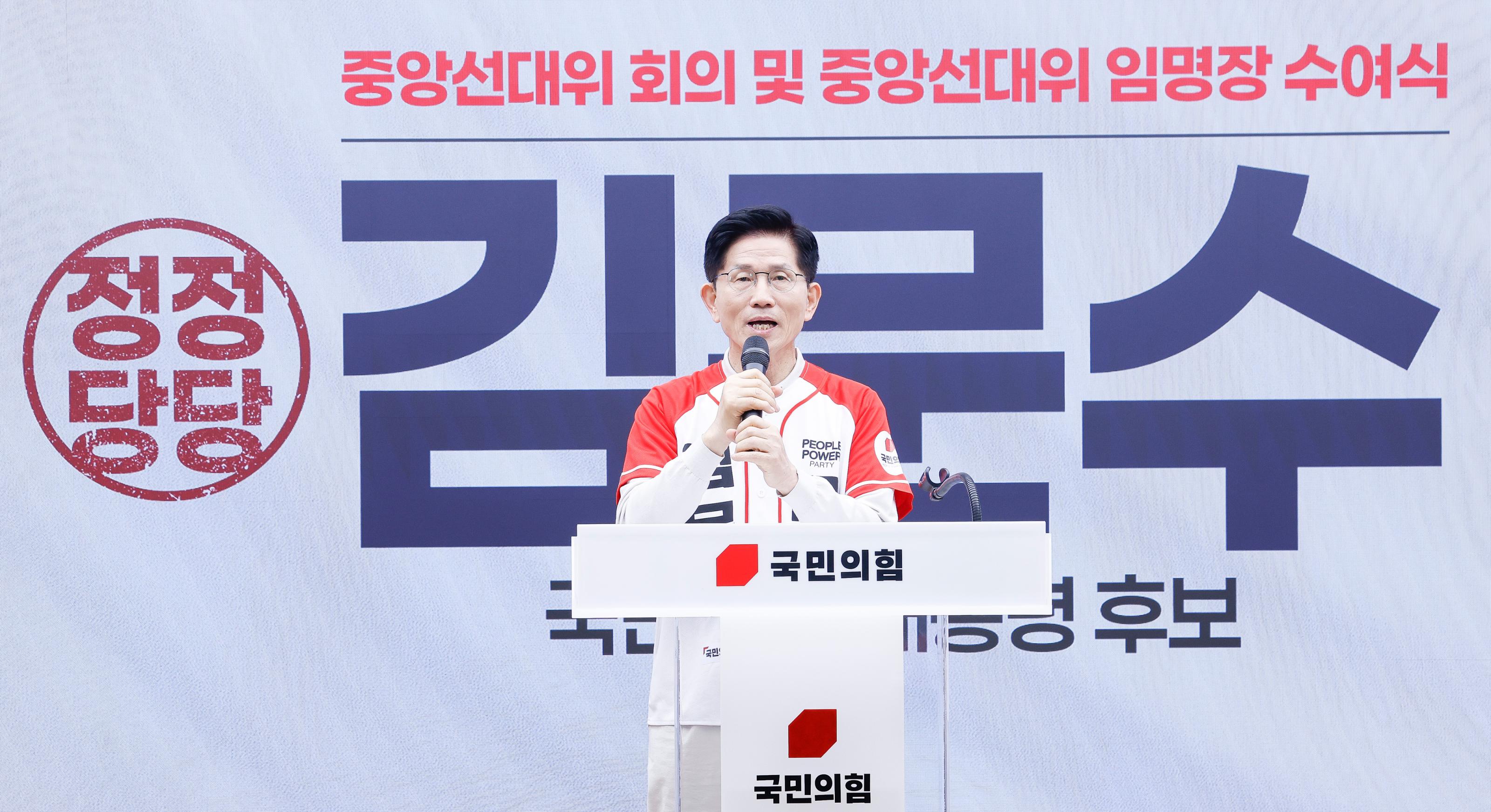 5月12日,国民力量党总统候选人金文洙在首尔一场活动上致辞。新华社/纽西斯通讯社